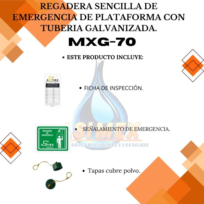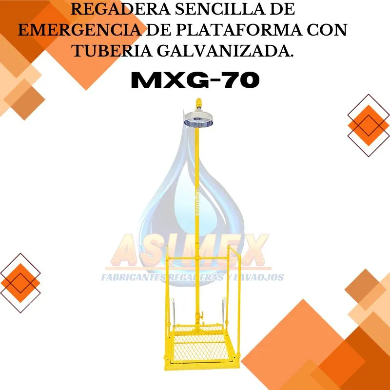 El modelo MXG-70 es una regadera sin lavaojos fabricada en acero galvanizado cédula 40, ideal para ambientes con baja exposición a agentes corrosivos.